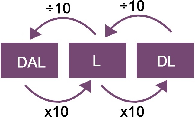 De formule van decaliter naar deciliter is: het aantal decaliter x100 = aantal deciliter.