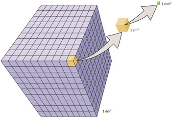 Een kubieke decimeter of milimeter heeft de zelfde inhoud van een kubus van 1 decimeter/milimeter lang, 1 decimeter/milimeter breed, 1 decimeter/milimeter hoog. in één kubus van 1 dm³ passen 1.000.000 kubussen in van mm³. In de afbleelding hieronder kun je dat goed zien.