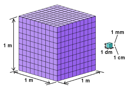 Een kubieke meter of decimeter is het zelfde als de inhoud van een kubus van 1 meter/decimeter lang, 1 meter/decimeter breed en 1 meter/decimeter hoog. Als je 1 m³ kubus hebt daar passen weer 1000 dm³ kubussen in, zoals je op onderstaande afbeelding kunt zien.
